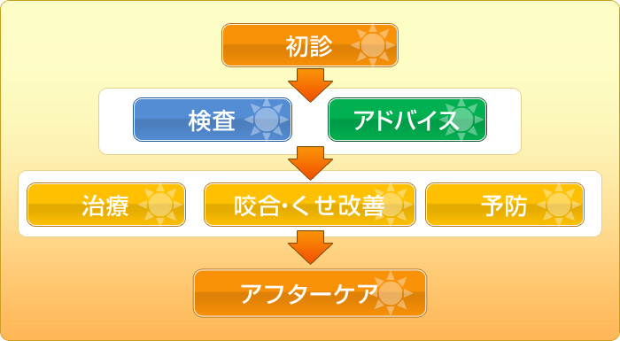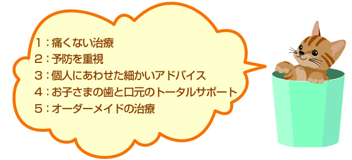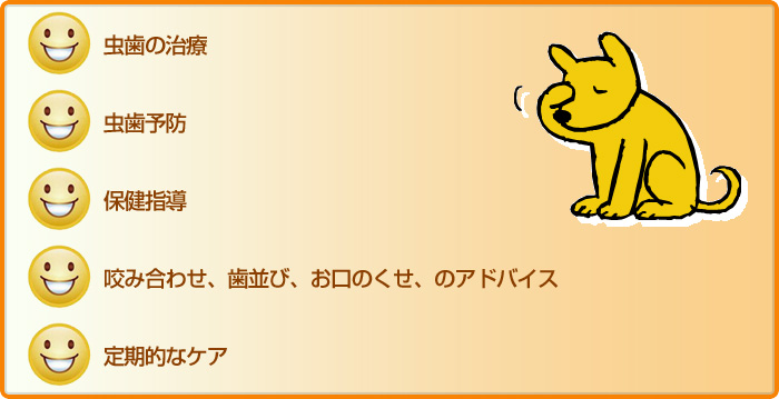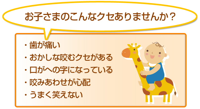 これらの症状は咬みあわせや、口の周りの筋肉のトレーニング、舌の癖などを治すことで改善されることがほとんどです。当院では、歯の治療だけでなく、お子さまの健康管理を目的としています。ご家庭での毎日の歯みがき、おやつなどの糖分の採り方、お口のトレーニングも含め、ご家族の方と一緒にお子さまの健康づくりをすすめていきたいと思っています。